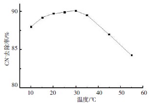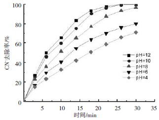 (5)不同pH 值條件下,CN-去除率差別很大,堿性條件下有利于CN-的去除,較優(yōu)的pH值為10。