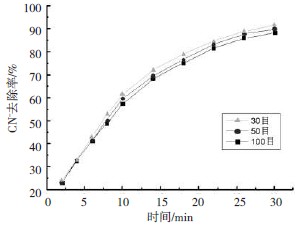 (2)實驗所考察的3 種粒徑的活性炭對CN-降解效果基本相同,說明活性炭外表面積的大小對反應(yīng)的影響很小。