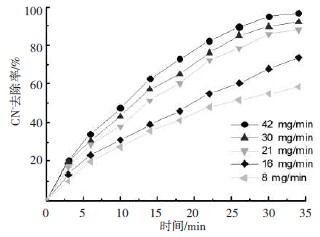 通過改變臭氧發(fā)生器出口氣體流量,考察了不同臭氧投加量對CN-的去除情況,結(jié)果如圖3 所示。