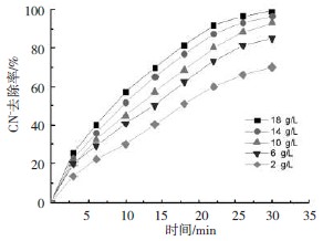 活性炭加入量對CN-去除率的影響如圖4 所示。