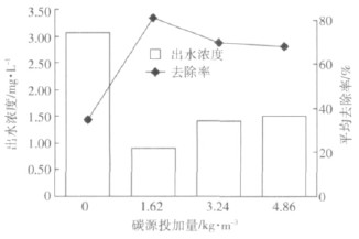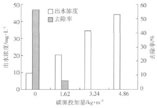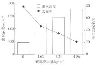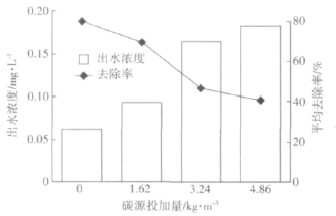 從圖3 可以看出,碳源投加量為0 時,NH4+-N平均去除率為79.09%,出水NH4+-N平均濃度為0.47mg·L-1,小于0.5 mg·L-1,達《地表水環境質量標準》(GB 3838—2002)Ⅱ類水質標準。隨著碳源投加量的增加,出水NH4+-N平均濃度逐漸增大(1.19~1.76 mg·L-1),NH+4-N 平均去除率逐漸降低(46.73%~20.72%)。