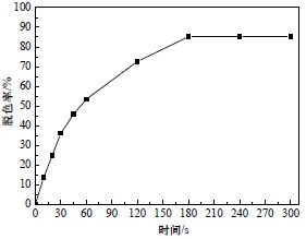 在臭氧流量為40 L/h,pH 為5,反應溫度為20 ℃,活性藏青初始廢水濃度為10 mg/L 的條件下進行實驗,確定臭氧的最佳通氣時間,結果如圖2 所示。由圖2 可見臭氧的通氣時間對水樣的處理效果影響很大。隨著時間的增加,水樣的吸光度越來越小,脫色率越來越大。當臭氧通氣時間達3 min 時,水樣的去除率達最大值85.2 %,之后趨于穩定,不隨時間的變化而變化。可能是因為水樣中剩下的雜質是臭氧所不能去除的,所以通入的臭氧都不再起作用。由此確定本試驗中臭氧的最佳通氣時間為3 min。