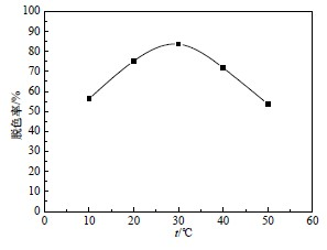 在三氯化鐵投加量為200 mg/L,皂土投加量為1 g/L,pH 為7,活性藏青廢水初始濃度為10 mg/L 的條件下,考察混凝溫度對處理廢水過程的影響,結果如圖6 所示。由圖6 可見反應溫度由10 ℃增高至50 ℃,色度的去除率逐漸增加,但增幅不大;溫度高于30 ℃后去除率反而下降。這可能是因為適當的溫度可以加速反應。溫度升高,反應速度加快,使得去除率提高,但也會抑制三氯化鐵的作用,溫度越高三氯化鐵越難發揮作用,導致脫色率下降[7]。本試驗表明在10~50 ℃的較寬溫度范圍內脫色率能夠達到滿意的降解效果,故本試驗中溫度控制在30 ℃左右,色度去除率可達到86.3 %。