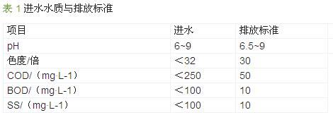 系統進水為現有洗艙廢水二級生化處理出水, 經深度處理后,須達到消防與綠化要求的回用水水質標準,廢水pH、色度、COD、BOD、SS 按文獻方法測定〔4〕。工程化裝置處理水量2.5 m3/h,廢水處理系統24 h 連續運行。設計進水水質和排放標準見表 1。