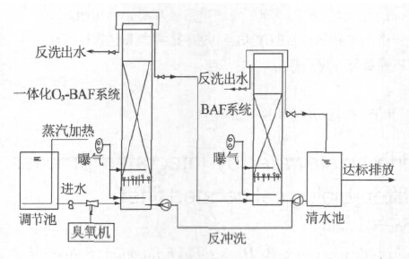 目前常采用化學氧化—生化組合工藝處理難生物降解有機廢水〔2〕,其中化學氧化可去除難降解有機物或改善廢水的可生化性,而生物處理技術具有處理費用低、對多種有機污染物處理效果好等優點。研究表明〔3〕,一體化臭氧曝氣生物濾池(O3-BAF)系統對含難生物降解有機物的廢水具有良好的處理效果且工藝簡單,占地面積少,運行成本低。