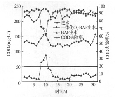 (3)BAF 系統。尺寸為2 m×2 m×4.5 m,碳鋼結構,三油兩布防腐。填料層高度3.2 m,填料采用粒徑為3~5 mm 的陶粒(孔隙率50%)。廢水經一體化O3-BAF 系統處理后,可生化性得到一定提高,后續采用BAF 系統進行生化處理,進一步去除有機物和懸浮物。該系統COD 容積負荷為0.8 kg/(m3·d),HRT 為4.6 h,氣水比為10∶1,布氣系統采用穿孔布氣。