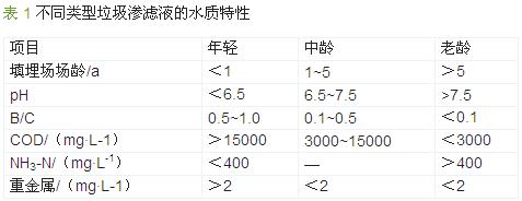 垃圾滲濾液是指垃圾在堆放和填埋過程中因發酵作用、降水淋溶、地表水和地下水滲透而產生的污水。垃圾滲濾液的成分受垃圾組成、垃圾填埋時間、填埋技術、氣候條件等因素影響,其中垃圾填埋時間是最主要的影響因素。若按填埋場場齡劃分,一般填埋時間在1 a 以下的為年輕滲濾液,1~5 a 的為中齡滲濾液,5 a 以上的為老齡滲濾液〔1〕。表 1 為不同類型垃圾滲濾液的特性〔2〕。