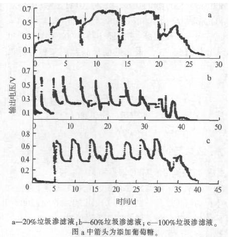 圖 2 陽極室使用不同體積分數垃圾滲濾液的產電情況