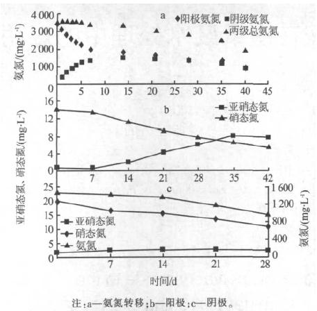 圖 4 氨氮在電池中的轉移情況及陽、陰極硝態氮和亞硝態氮的變化