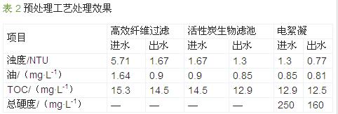 預處理是為了確保雙膜系統的穩定運行,因此試驗中雙膜前預處理選擇高效纖維過濾+生物活性炭+電絮凝組合工藝。污水場生化出水經高效纖維過濾可去除廢水中絕大部分的懸浮物,出水中的有機污染物經生物活性炭處理后進一步降低; 在電絮凝工藝中加入氫氧化鈉控制廢水pH 在10.5 左右,可去除廢水中部分離子。試驗結果表明:高效纖維過濾對顆粒物的去除率可達70%,對油的去除率達到 45%;生物活性炭對濁度的去除率為41%,對有機物去除率為11%;電絮凝工藝主要去除硬度,去除率為35%,出水總硬度為160 mg/L,達到了試驗要求。