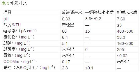 預處理產水進入超濾系統〔5〕進一步去除顆粒物和膠體物質后經反滲透脫鹽〔6〕直接回用至離子交換系統。目前該廠離子交換系統補水為新鮮水。將試驗產水與新鮮水和一級除鹽水進行水質對比,見表 3。從表 3 看出,試驗產水水質明顯優于新鮮水水質,可滿足回用要求。