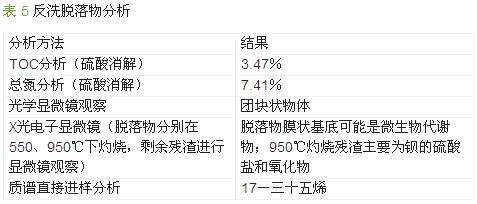 由表 4、表 5 分析結果可以看出,造成超濾膜污染的主要污染物初步判斷為有機物,因此當超濾系統污堵后對其進行化學清洗時需采用堿洗〔7〕。