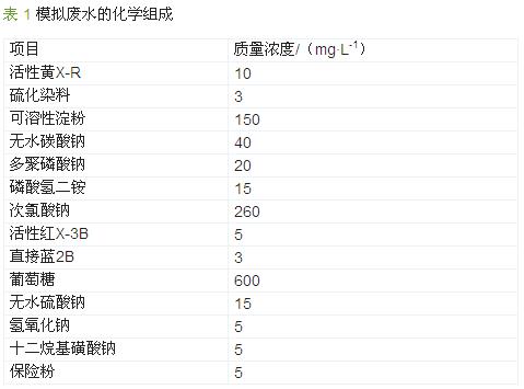 試驗所用模擬廢水由少量生活污水(體積分數約20%)添加各種染料和化學試劑配成,組成見表 1。
