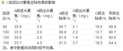 試驗期間為了考察系統整體的性能,硝化液回流比保持在80%。此后改變回流比考察其對氨氮去除效果的影響,結果見表 2。