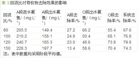 硝化液回流比同樣會影響A/O 系統對廢水中有機物的降解效果。不同回流比對有機物的脫除效果影響見表 3。表 3 表明:增大回流比對于好氧段去除有機物是有利的,尤其回流比在100%~120%時, A/O 體系對有機物的去除率接近80%。但對于缺氧段來說,提高回流比并未對有機物的降解帶來益處。綜合表 2、表 3 可知,對于該一體化A/O 體系,回流比過大對脫氮和能耗均不利,以介于80%~100% 為宜。