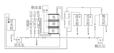 循環(huán)水排污水經(jīng)過增壓泵、機械過濾器、活性炭過濾器、精密過濾器進入電滲析原水箱中;供水泵一次性供給濃水室、淡水室和極水室;濃水、淡水、極水的流量和壓力由調(diào)節(jié)閥控制; 濃水進入濃水箱后排放,淡水進入淡水箱后再返回到補水系統(tǒng)中,極水全部回到原水箱中。