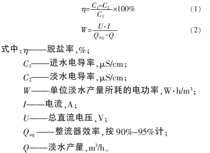 通過整流器的電流表、電壓表直接讀出工作電流和電壓,并按式(1)、式(2)計算脫鹽率、耗電量。