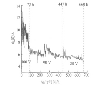 工作電壓是電滲析器在實際應(yīng)用中的一個主要參數(shù),它既關(guān)系到電滲析器的電流效率也關(guān)系到整個運行過程的能量消耗。控制一定工作電壓運行,可以有效避免由于電流過大所造成的電流由電極橫向通過臨近的膜傳到濃水內(nèi)流道中,產(chǎn)生熱而損壞電極附近的一些隔板和膜的現(xiàn)象〔3〕。根據(jù)現(xiàn)場排污水電導(dǎo)率大小及對脫鹽率的要求(約70%),控制電滲析器分別在100、90、80 V 下進行連續(xù)運行試驗,其中工作電壓為100 V 時運行72 h,工作電壓為90 V 時運行375 h,工作電壓為80 V 時運行213 h,共計連續(xù)運行660 h。在整個試驗過程中,主要是考察電滲析器在同一進水條件下,3 種工作電壓時脫鹽率、工作電流、能耗的變化。最終給出一個最佳運行電壓、電流、脫鹽率和能耗及運行費用。