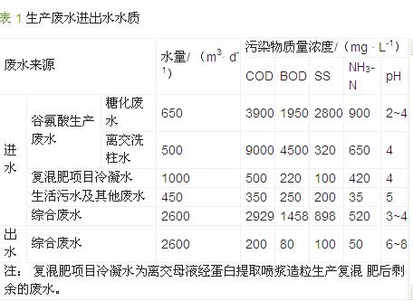 甘肅某生物科技有限公司隨著谷氨酸生產(chǎn)線生產(chǎn)規(guī)模的擴(kuò)大和生產(chǎn)工藝的升級(jí),目前的生產(chǎn)廢水處理系統(tǒng)及相關(guān)配套設(shè)備已不能滿足生產(chǎn)廢水水量、水質(zhì)的要求。因此,需要對(duì)現(xiàn)有廢水處理系統(tǒng)及配套設(shè)施進(jìn)行升級(jí)改造,以滿足廢水處理需要。處理后的水質(zhì)要求達(dá)到《味精工業(yè)污染物排放標(biāo)準(zhǔn)》(GB 19431—2004)。生產(chǎn)廢水實(shí)際進(jìn)水及設(shè)計(jì)出水水質(zhì)見(jiàn)表 1。
