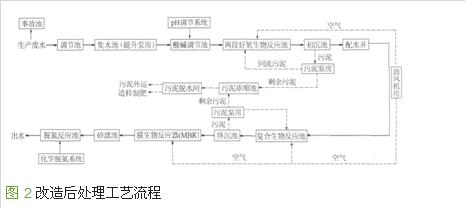 根據(jù)本工程的特點(diǎn),改造時(shí)針對(duì)特征污染物的去除,結(jié)合原有廢水處理設(shè)施,采用好氧生物+復(fù)合生物兩段生物組合處理工藝,即由調(diào)節(jié)池+pH 調(diào)節(jié)系統(tǒng)+好氧生物系統(tǒng)+初沉池+復(fù)合生物池+終沉池+ MBR+砂濾池+化學(xué)脫氮組成的主體處理工藝,確保污水處理達(dá)標(biāo)排放。剩余污泥利用原有污泥處理設(shè)施,采用污泥濃縮+污泥機(jī)械脫水的工藝處理。改造后的污水處理工藝流程如圖 2 所示。