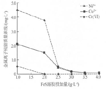 (2)納米FeS 溶膠兼有沉淀劑和還原劑2 種功能,能同時處理電鍍廢水中的Cr(Ⅵ)和Cu2+、Ni2+等重金屬離子。