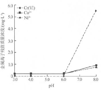 實驗廢水:實驗廢水采用模擬廢水,其中含Cr(Ⅵ)50 mg/L、Ni2+ 50 mg/L、Cu2+50 mg/L、乙二胺四乙酸二鈉(EDTA)5 mg/L、酒石酸鉀鈉5 mg/L。