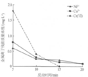 取200 mL 模擬廢水于250 mL 燒杯中,調節pH為4.0,加入3.0 g/L 10% 的納米FeS 溶膠,分別置于磁力攪拌器上攪拌5、10、15、20 min; 調節pH 為8.0,加入1 mL 0.5% 的PAM 溶液,靜置5 min,濾紙過濾,測定濾液中的金屬離子濃度。反應時間對處理效果的影響如圖 3 所示。