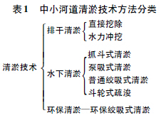 由于近些年我國港口、航道、內(nèi)河以及湖泊清淤工程眾多,疏浚、清淤技術(shù)得到長足發(fā)展,裝備能力也大大提升,但能夠進入中小河道和農(nóng)村河道的專用船只和設備卻并不常見。最常用的中小河道清淤技術(shù)可分類如表1 所示。
