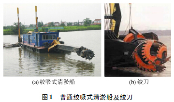 c.普通絞吸式清淤: 普通絞吸式清淤主要由絞吸式挖泥船完成。絞吸式挖泥船由浮體、鉸絞刀、上吸管、下吸管泵、動力等組成。它利用裝在船前的橋梁前緣絞刀的旋轉(zhuǎn)運動,將河床底泥進行切割和攪動,并進行泥水混合,形成泥漿,通過船上離心泵產(chǎn)生的吸入真空,使泥漿沿著吸泥管進入泥泵吸入端,經(jīng)全封閉管道輸送(排距超出挖泥船額定排距后,中途串接接力泵船加壓輸送) 至堆場中。普通絞吸式清淤船及絞刀如圖1 所示。