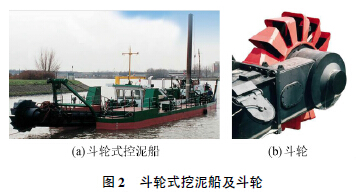 d.斗輪式清淤: 利用裝在斗輪式挖泥船上的專用斗輪挖掘機開挖水下淤泥,開挖后的淤泥通過挖泥船上的大功率泥泵吸入并進入輸泥管道,經(jīng)全封閉管道輸送至指定卸泥區(qū)。斗輪式挖泥船及斗輪如圖2 所示。斗輪式清淤一般比較適合開挖泥層厚、工程量大的中、大型河道、湖泊和水庫,是工程清淤常用的方法。清淤過程中不會對河道通航產(chǎn)生影響,施工不受天氣影響,且施工精度較高。但斗輪式清淤在清淤工程中會產(chǎn)生大量污染物擴散,逃淤、回淤情況嚴重,淤泥清除率在50% 左右,清淤不夠徹底,容易造成大面積水體污染。