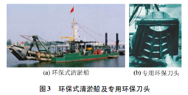 環(huán)保絞吸式清淤是目前最常用的環(huán)保清淤方式,適用于工程量較大的大、中、小型河道、湖泊和水庫,多用于河道、湖泊和水庫的環(huán)保清淤工程。環(huán)保絞吸式清淤是利用環(huán)保絞吸式清淤船進行清淤。環(huán)保絞吸式清淤船配備專用的環(huán)保絞刀頭,清淤過程中,利用環(huán)保絞刀頭實施封閉式低擾動清淤,開挖后的淤泥通過挖泥船上的大功率泥泵吸入并進入輸泥管道,經(jīng)全封閉管道輸送至指定卸泥區(qū)。環(huán)保式清淤船及專用環(huán)保刀頭如圖3 所示。
