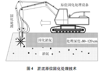 b.堆場表層處理技術(shù)。清淤泥漿的初始含水率一般在80% 以上,而淤泥的顆粒極細小,黏粒含量都在20%以上,這使得泥漿在堆場中沉積速度非常緩慢,固結(jié)時間很長。吹淤后的淤泥堆場在落淤后的兩三年時間內(nèi)只能在表面形成20 cm左右厚的天然硬殼層,而下部仍然為流態(tài)的淤泥,含水率仍在1. 5 倍液限以上,進行普通的地基處理難度很大[13]。堆場表層處理技術(shù)則是利用淤泥堆場原位固化處理技術(shù)(圖4),人為地在淤泥堆場表面快速形成一層人工硬殼層,人工硬殼層具有一定的強度和剛度,滿足小型機械的施工要求,可以進行排水板鋪設和堆載施工,從而方便對堆場進一步的處理。人工硬殼層的設計是表層處理技術(shù)的關(guān)鍵,主要考慮后續(xù)施工的要求,結(jié)合下部淤泥的性質(zhì),通過試驗和模擬確定硬殼層的強度參數(shù)和設計厚度,人工硬殼層技術(shù)又往往和淤泥固化技術(shù)相結(jié)合形成固化淤泥人工硬殼層,也可以利用聚苯乙烯泡沫塑料(EPS) 顆粒形成輕質(zhì)人工硬殼層則效果更佳。