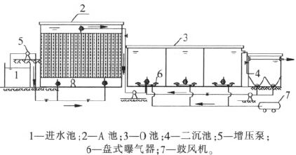 實驗裝置如圖 1 所示。該套反應器由進水池、A池、O 池和二沉池組成,其中A 池,長為2.75 m,寬為2.75m,高為2.0m,池內裝有半軟性組合填料和底部污泥推流裝置,采用底部進水,上部出水的方式;O 池為曝氣池,長為4.0 m,寬為2.5 m,高為1.26 m,池內添加活性污泥,活性污泥取自污水處理廠曝氣池,在底部采用盤式曝氣器曝氣,采用底部進水上部出水的進出水方式。