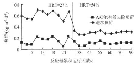 進水負荷對去除負荷影響的實驗結果如圖 2 所示。進水負荷與二級A/O 的有效去除負荷呈現相同趨勢。在反應器運行的前35 d,進水負荷波動較大,進水負荷基本在0.5~0.8 kg/(m3·d),而二級A/O的有效去除負荷都基本保持在0.2 kg/(m3·d),說明該反應器易于啟動,并在很短的時間內穩定運行。從35 d 以后,進水負荷從0.6 kg/(m3·d) 降到0.3kg/(m3·d) 左右,但二級A/O 有效去除負荷只降了0.1 kg/(m3·d),并且基本保持很長的一段時間,說明在腈綸廢水中存在一定的難降解有機物,降低進水負荷或延長反應器運行時間都對其作用不大〔6〕。