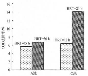 停留時間對出水COD 影響的實驗結果如圖 3所示。不同的HRT 對于出水COD 有一定的影響,二級A 池HRT 從15 h 提高到30 h 時,去除率上升的不明顯,只有0.8%;二級O 池HRT 從12 h 提高到24 h 時,去除率上升很明顯,達到7.0%。二級A 池HRT 從15 h 延長到30 h 的過程中,COD 去除效果變化不明顯。原因在于酸化水解過程中有機物主要發生斷鏈等變化,而很少進行徹底降解〔7〕。因此不能夠使COD 的去除效果得到顯著降低。所以A 池能夠有效提高廢水的可生化性,為后續O 池的處理提供了有利條件; 二級O 池由于進水的生化性提高,HRT 的延長為世代時間較長的硝化細菌優先附著在填料生物膜上提供了良好的生長條件,在曝氣池容積不變的情況下,降低了污泥負荷,為生物反應器中取得較好的效果提供了條件〔8〕。說明延長HRT 的時間,能夠提高COD 的去除效果。