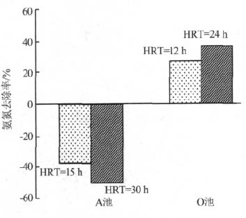 停留時間對出水氨氮影響的實驗結果如圖 4 所示。二級A 池出水氨氮濃度升高,去除率為負值,停留時間越長,出水氨氮濃度越高,當二級A 池停留時間為30 h 時,氨氮去除率可達-50%左右,因為腈綸廢水多為毒性較大的含氮有機物(如丙烯腈),在經過生物降解后都會生成氨氮,以至出水中氨氮含量增加〔9, 10〕,當二級O 池HRT 在12 h 和24 h時,氨氮的去除率分別為27.3%和36%。隨著停留時間的延長,氨氮去除率增加,但并不明顯,說明單純延長HRT 對于氨氮的降解貢獻不大〔11〕。