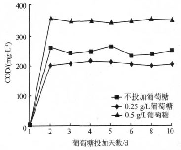 一些難降解的有機物,通過微生物的作用能被改變化學結構,但是不能被用作碳源和能源,微生物必須從其他底物獲取大部分或全部的能源和碳源,這一過程稱之為共代謝〔12〕。這種底物又稱為共基質。基于共基質條件常是一些生物難降解物的主要降解機制〔13〕,考察向厭氧廢水中添加葡萄糖對腈綸廢水中難降解有機物部分強化生物去除的效果。