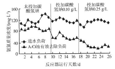 (4)進水堿度也對出水氨氮具有很大的影響,當碳酸氫鈉的投加量為0.25 g/L 時,出水氨氮可降至20 mg/L 左右。具體參見http://www.bnynw.com更多相關技術文檔。