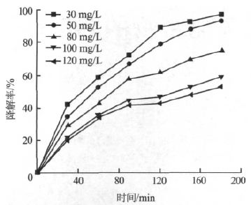 改變p-NA 廢水溶液的初始質(zhì)量濃度(分別為30、50、80、100、120 mg/L),考察在UV/Fe0 反應(yīng)體系中p-NA 的降解率。其結(jié)果如圖 3 所示。