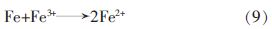 比較了UV/Fe0 體系和UV/Fe2+體系對p-NA 的降解效率,從圖 4 可以看出,UV/Fe0 體系對p-NA 的降解效果更好,這表明UV/Fe0 體系中Fe2+的產(chǎn)生與H2O2的生成相匹配。即一次性投加的Fe0 首先被氧化成Fe2+,產(chǎn)生的Fe2+與H2O2發(fā)生Fenton 反應(yīng)生成·OH 和Fe3+,之后體系中Fe0 進一步與Fe3+作用生成Fe2+,如反應(yīng)式(9),從而減少了Fe3+與H2O2的類Fenton 反應(yīng)〔11〕,使得p-NA 的降解效率提高。
