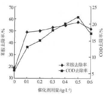 實驗研究了采用自制光催化劑的單一可見光催化工藝處理模擬苯胺廢水的效果。考察了在不調節廢水pH、可見光照射條件下,反應時間為1 h 時,光催化劑投加量對處理效果的影響,結果見圖 1。