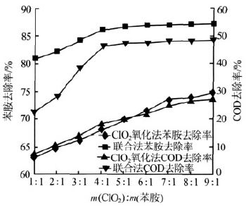 在廢水初始pH 條件下,我們分別采用ClO2氧化-光催化聯合處理法與單獨ClO2氧化法對苯胺廢水進行處理,得到兩種處理方法的處理效果見圖 2。