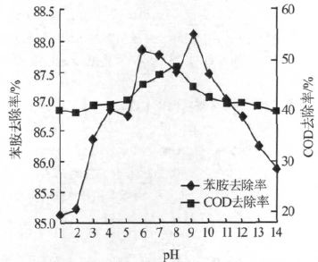 圖 3 反應pH 對苯胺和COD 去除率的影響