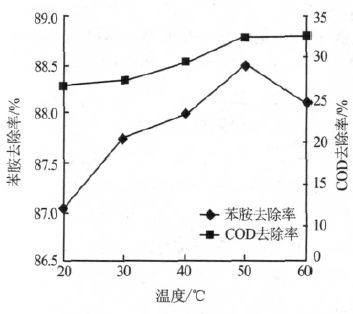圖 4 反應溫度對苯胺和COD 去除率的影響