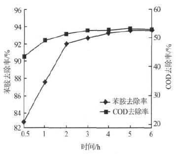 (2)苯胺廢水的pH 對處理效果有影響,當pH為6~10 時,可以達到較優處理效果;反應溫度對處理效果影響不大;反應時間為4 h,反應體系的COD去除率趨于平衡。