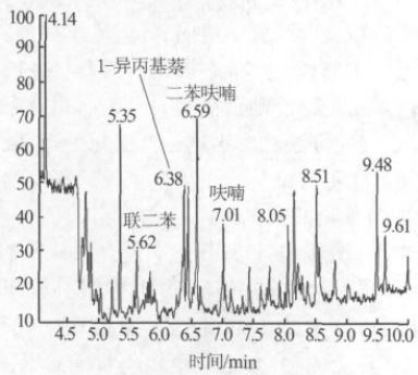 從圖 4、圖 5 可見,原水圖譜中出峰較密集,比較出峰有機物總數與總積分面積,可粗略衡量吸附對水樣中總有機物的去除情況〔6〕。利用質譜全離子掃描模式下的總離子流圖譜,依據已有色譜圖庫進行檢索分析。對相似度在50%以上的峰進行定性分析,5.62 min 出峰的聯二苯、6.38 min 出峰的1-異丙基萘、6.59 min 出峰的二苯呋喃、7.01 min 出峰的呋喃、8.15 min 出峰的菲等在出水圖譜中已不再出現,說明這類物質已被改性蘭炭吸附。具體參見http://www.bnynw.com更多相關技術文檔。