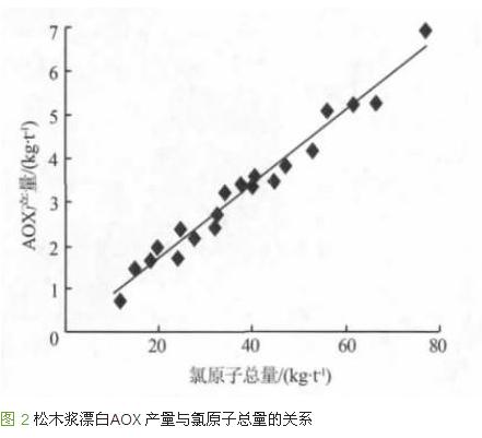 當紙漿漂白使用的有效氯相等時,用ClO2替代Cl2能減少AOX 的產(chǎn)生量。這是因為ClO2替代Cl2后,參加反應的Cl 減少,使得有機氯化物的產(chǎn)生量也隨之減少。圖 2 是松木漿漂白過程中AOX 產(chǎn)量與氯原子總量的關系。