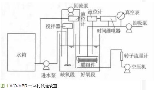 A/O-MBR 一體化試驗裝置如圖 1 所示。反應器采用板厚10 mm 的有機玻璃制成,總有效體積為6.7 L,有效水深為140 mm。系統(tǒng)采用連續(xù)進水間歇出水的方式,抽8 min 停2 min,進出水均由液位計控制。試驗采用國內某公司產聚偏氟乙烯中空纖維膜,有效膜面積為0.02 m2,膜池底部采用穿孔管曝氣供氧和進行膜面沖刷。
