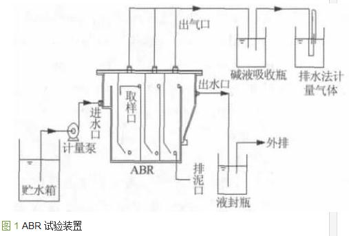 ABR 采用有機玻璃板加工制成,尺寸為455mm×150 mm×400 mm,有效容積為20 L,置于(35±1) ℃的恒溫箱中。反應器分3 個格室,每室由上流室和下流室(體積比為3∶1)組成,折流板底角為45°,各格室體積比V1∶V2∶V3=1.5∶1∶1。每室側部設取樣口,頂部設導氣口。自配水存放于貯水箱中,由計量泵打入反應器第1 格室,以上下折流形式流經各格室,最后由第3 格室流出,出水經液封后排出系統。試驗裝置見圖 1。