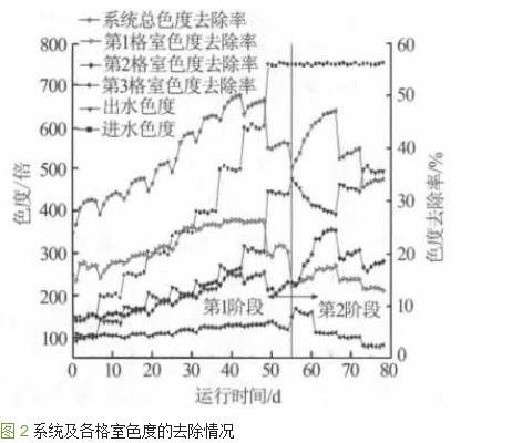 啟動運行過程中,系統及各格室色度變化及去除情況見圖 2。
